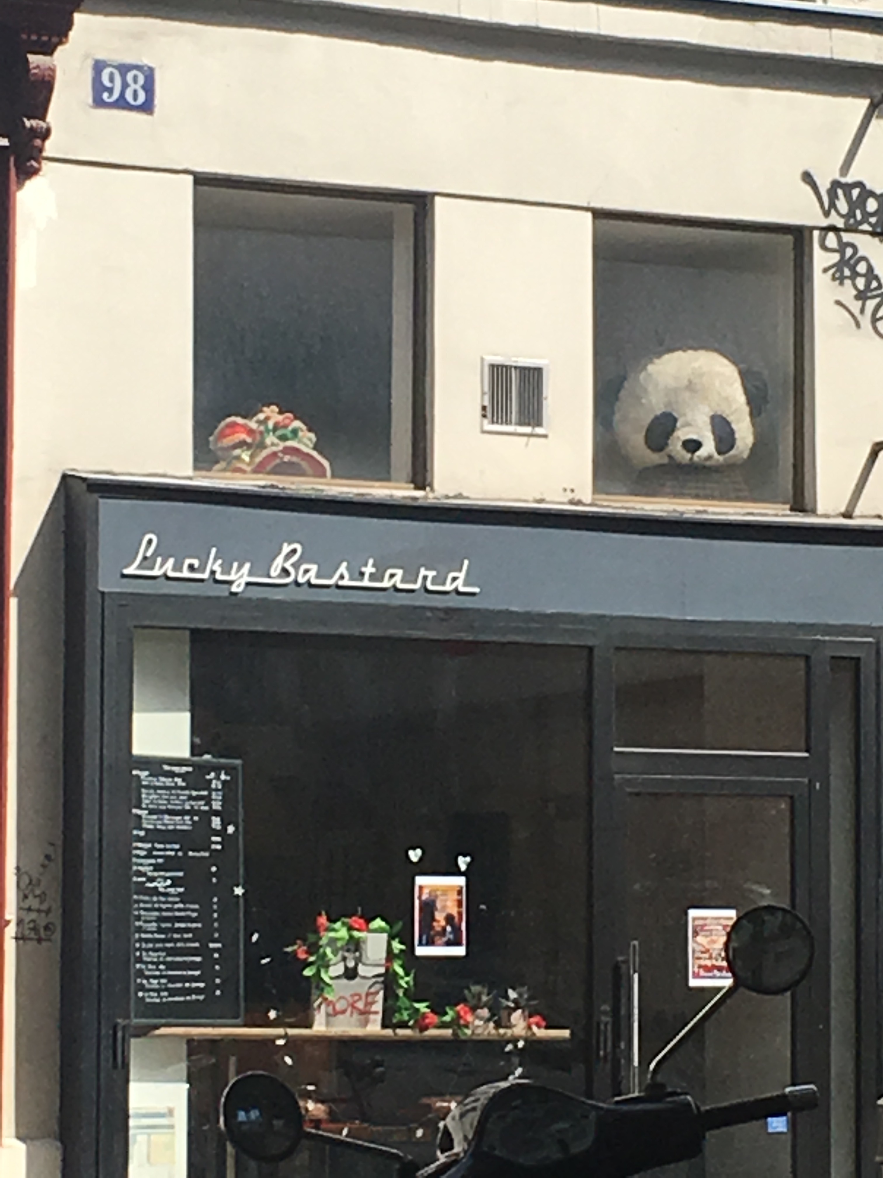 Paris’te Les Marais bölgesinde Marché des Enfants-Rouges da yemeğimizi bir İtalyan lokantasında yiyoruz. Orecchiette Truffle dedikleri trufle yagi ile yapilan ve makarnasi da kulak memesi şeklinde olan bu makarnaya bayıldım, Sonrasında yine aynı bölgede sokaklarda dolaşıyor ve gençlerin gelmesini bekliyoruz. Hava o kadar guzelki ne heykeli oldugunu çok bilmediğim bır anıtın önğndeki banka oturduğumuzda, kafamı Basrinin dizlerine koyup, biraz uzanıyorum. Bir 10 dakika kadar kestirmişim sanırım. Yattığım yerden, gözümü actığımda yolun karşısında bir dükkanın üst katından bana bakan bu oyuncak panda ile kaşılaşıyorum. Kafenin üst penceresinden bakan bu kocaman panda bir kez daha hatırlatıyor arada bir kafayı kaldırıp yukarıyada bakmak lazım diye.